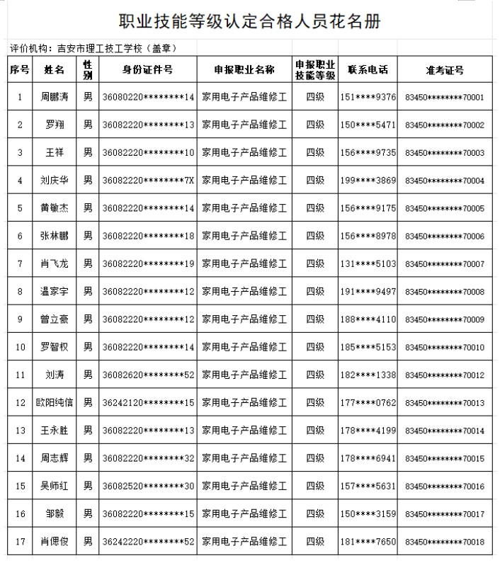 按照《贛人社規(guī)【2022】7號》文件精神。我校于2025年3月27日開展了家用電子產(chǎn)品維修工等級認定,共18人(四級),通過認定考核17人?,F(xiàn)對認定考核合格人員進行公示。(名單附后)