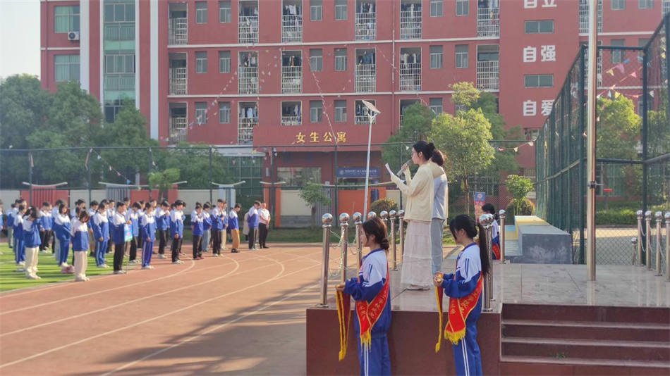 隨著激昂的入場音樂響起,師生們迅速有序地集合在操場。升旗儀式正式開始,護(hù)旗手們精神抖擻、步伐整齊,護(hù)衛(wèi)著五星紅旗邁向升旗臺。當(dāng)《義勇軍進(jìn)行曲》奏響,五星紅旗冉冉升起,全體師生莊嚴(yán)肅立,行注目禮,齊聲高唱國歌,歌聲嘹亮,愛國之情在每個(gè)人心中激蕩。
