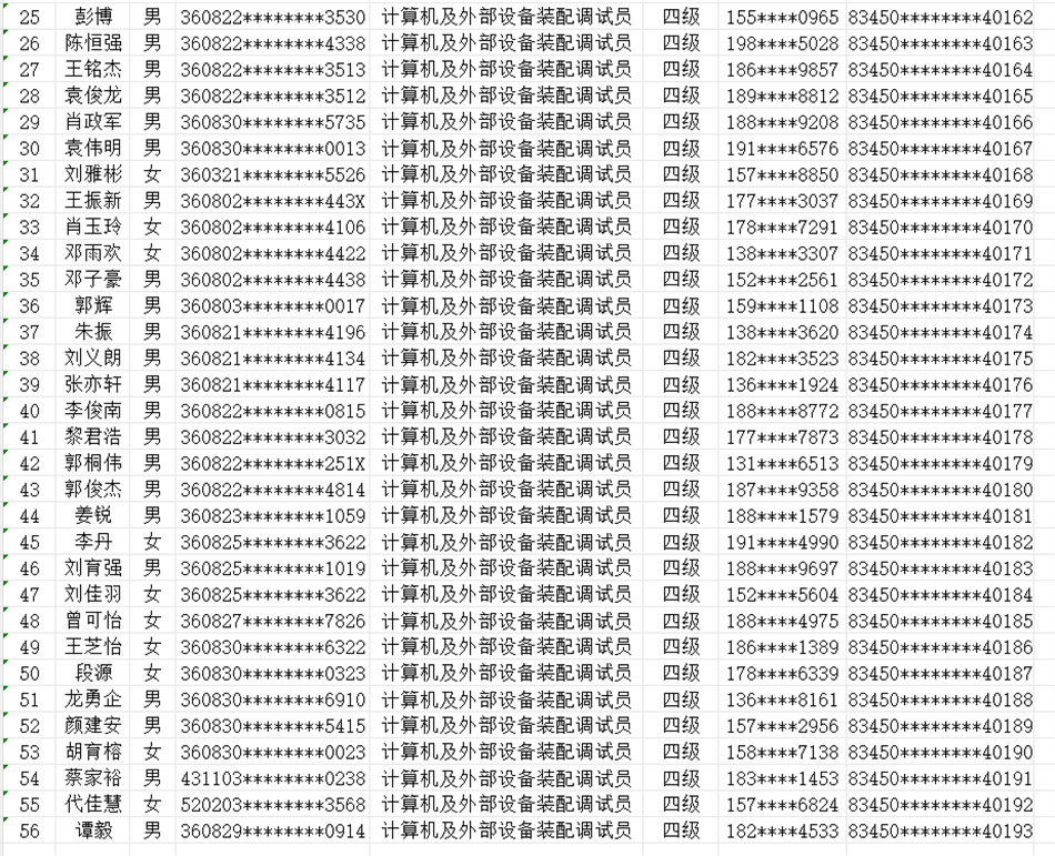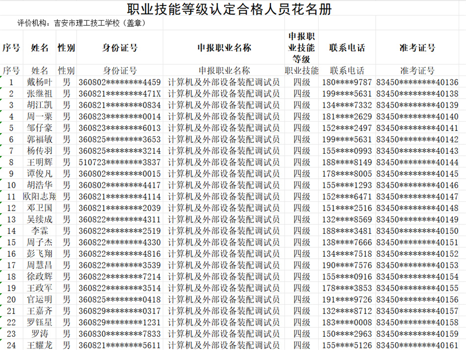 按照《贛人社規(guī)〔2022〕7號》文件精神。我校于2025年10月24日開展了計(jì)算機(jī)及外部設(shè)備裝配調(diào)試員(計(jì)算機(jī)整機(jī)裝配調(diào)試員)等級認(rèn)定,共58人(四級),通過認(rèn)定考核56人?,F(xiàn)對認(rèn)定考核合格人員進(jìn)行公示。(名單附后)