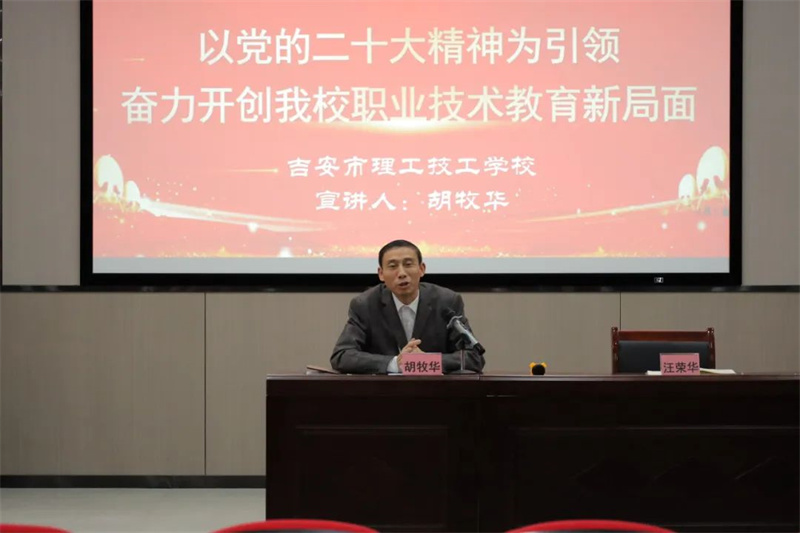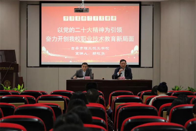 為深入學(xué)習(xí)宣傳貫徹黨的二十大精神,2022年11月28日下午,吉安市理工技工學(xué)校在校報(bào)告廳召開(kāi)了學(xué)習(xí)黨的二十大精神宣講報(bào)告會(huì),校黨支部專職副書記胡牧華以《以黨的二十大精神為引領(lǐng),奮力開(kāi)創(chuàng)我校職業(yè)技術(shù)教育新局面》為主題,為全校師生作專題宣講,執(zhí)行校長(zhǎng)汪榮華等學(xué)校相關(guān)領(lǐng)導(dǎo)及全體共產(chǎn)黨員、全校教職員工積極參與并且認(rèn)真聽(tīng)取了報(bào)告會(huì)。