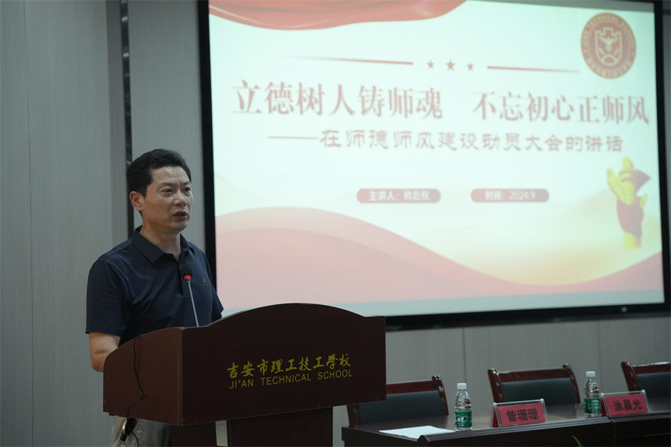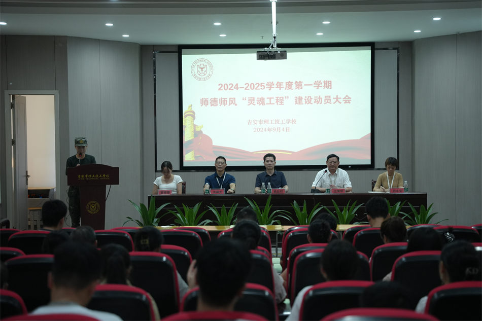 時維九月,序?qū)偃?。為了進一步提高廣大教師的職業(yè)道德水平,為學(xué)生的健康成長提供更好的教育環(huán)境,加快推動學(xué)校教育事業(yè)健康發(fā)展,努力辦好人民滿意的教育,2024年9月4日,吉安市理工技工學(xué)校隆重地舉行了一場師德師風(fēng)“靈魂工程”建設(shè)動員大會。會議由執(zhí)行校長汪榮華主持。