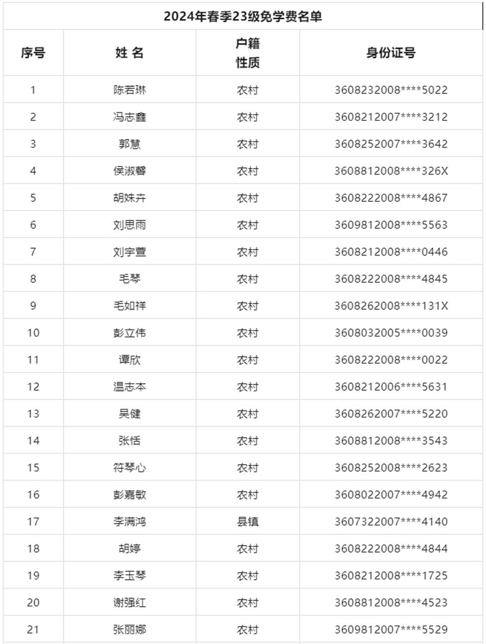 2024年春季學期我校21級學生免學費申報526人,22級免學費申報394人,23級免學費293人,22級助學金143人,23級助學金90人,具體申報名單見以下,公示日期為4月2日至4月12日。如有疑問請于公示日期內(nèi)向校紀檢監(jiān)察室或省人力資源和社會保障廳職業(yè)能力建設處反映。
